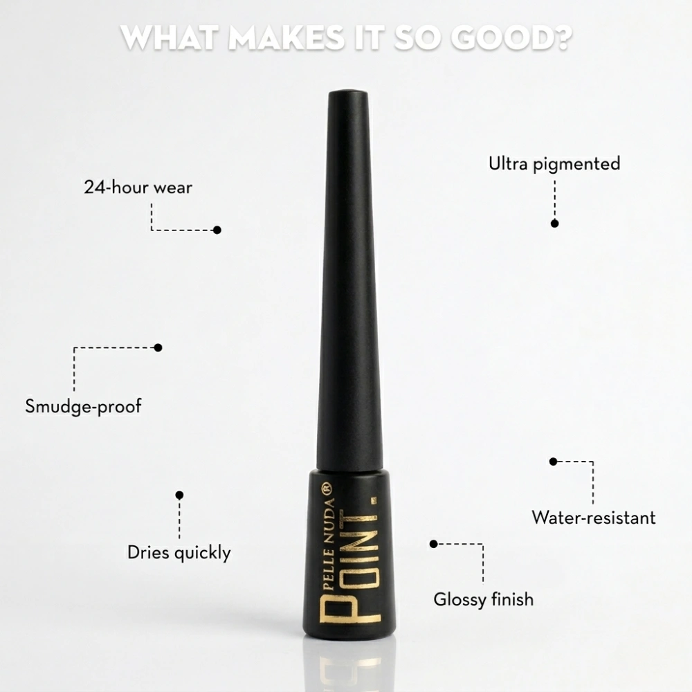 Engineered with an ultra-deep black pigment and an advanced waterproof, smudge-proof formula, Point delivers rich, opaque colour from the very first stroke and holds it flawlessly for up to 12 hours.